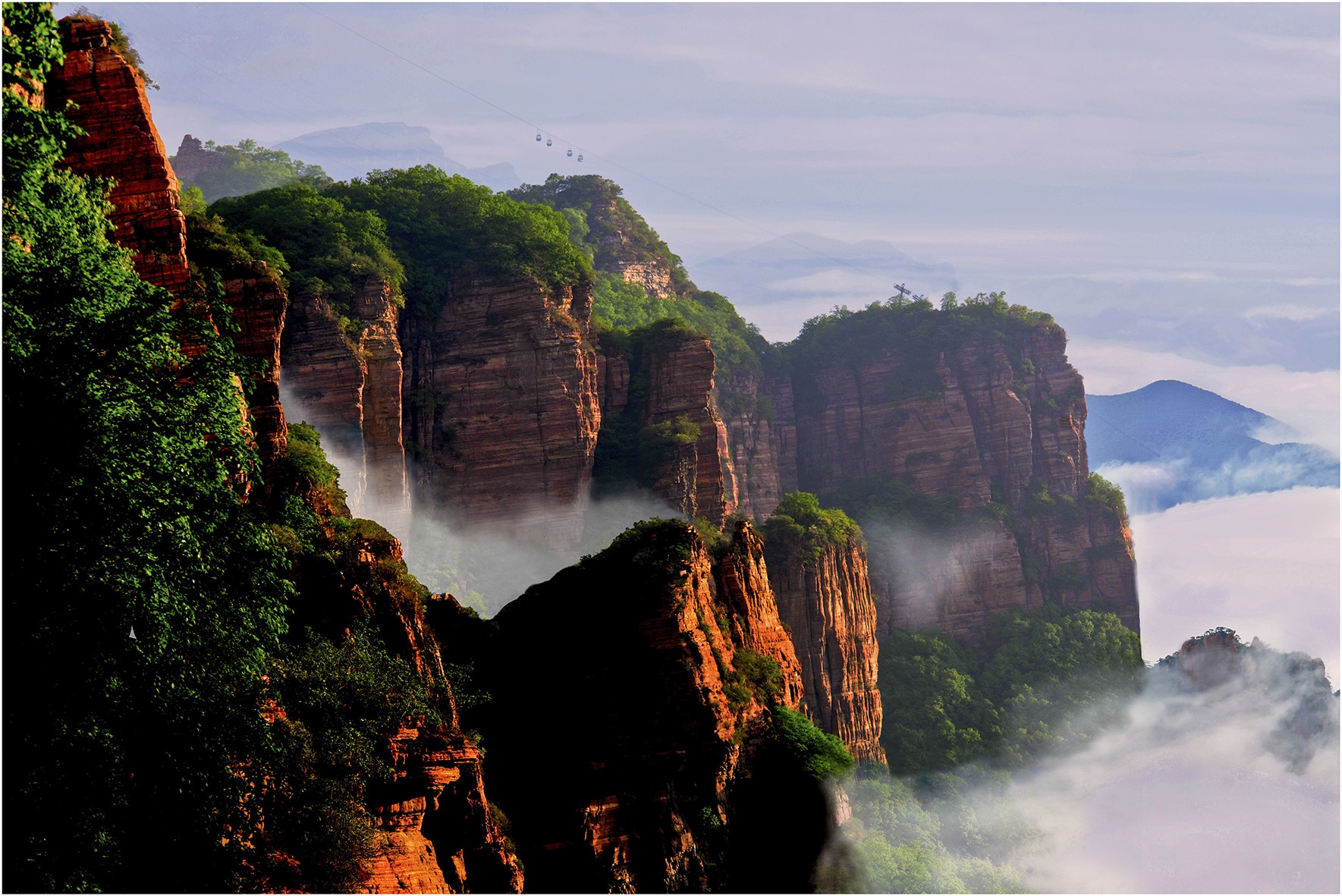 图片来源于网络,如有侵权,请联系告删嶂石岩风景名胜区位于河北省石家庄市赞皇县嶂石岩镇嶂石岩村,距离省会石家庄市区约110公里,是太行山森林公园的精华所在。该景区占地面积约120平方公里,拥有国家级风景名胜区的称号,并被评定为国家AAAA级旅游景区。嶂石岩地貌经由国家旅游、地质部门鉴定,与丹霞地貌、张家界地貌并称为中国三大旅游砂岩地貌。景区内特色景点为大型天然回音壁,最高点黄庵垴海拔1774米,可俯瞰两省五县。嶂石岩景观主要为“丹崖、碧岭、奇峰、幽谷”,四季景色各异,春天桃李满山,夏日森荫密蔽,秋季红叶满山,冬季冰柱倒悬,是华北地区保护较好、品种较全的“天然植物园”,也是休闲避暑的胜地。