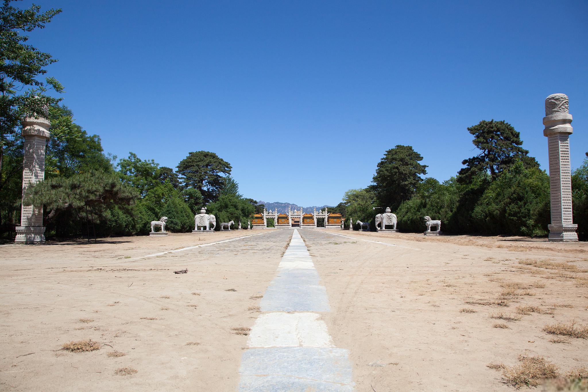 3、景区简介:清西陵,位于河北省保定市易县梁各庄西15公里处的永宁山下,离北京98公里。清西陵是清代四位皇帝的陵寝之地,始建于雍正八年(1730年),完工于民国四年(1915年),其间185年。是现存规模宏大,保存最完整,陵寝建筑类型最齐全的古代皇室陵墓群。清西陵共有14座陵墓,包括雍正帝泰陵、嘉庆帝昌陵、道光帝慕陵和光绪帝崇陵,还有3座后陵。此外,还有怀王陵、公主陵、阿哥陵、王爷陵等共14座。其建筑形式体现着封建的典章制度,帝陵和后陵均用黄色琉璃瓦盖顶;妃嫔、公主、王爷园寝则以绿琉璃瓦或灰布瓦盖顶。清西陵面积达800余平方公里,建筑面积达5万余平方米,有宫殿1000余间,石雕刻和石建筑100余座。清西陵建筑基本上是相沿明代帝后妃陵寝建筑样式修筑而成,它依据清官式作法,在严格遵守森严等级制度的同时,又不拘泥于典制,具有很强的创造性。清西陵众多建筑有彩画与雕刻,宫殿多施旋子彩画,庙宇牌坊多施和玺彩画,行宫、住宅多施苏式彩画,雕刻以龙凤最多。整个建筑群反映出清代建筑艺术的高超水平和民族风格。