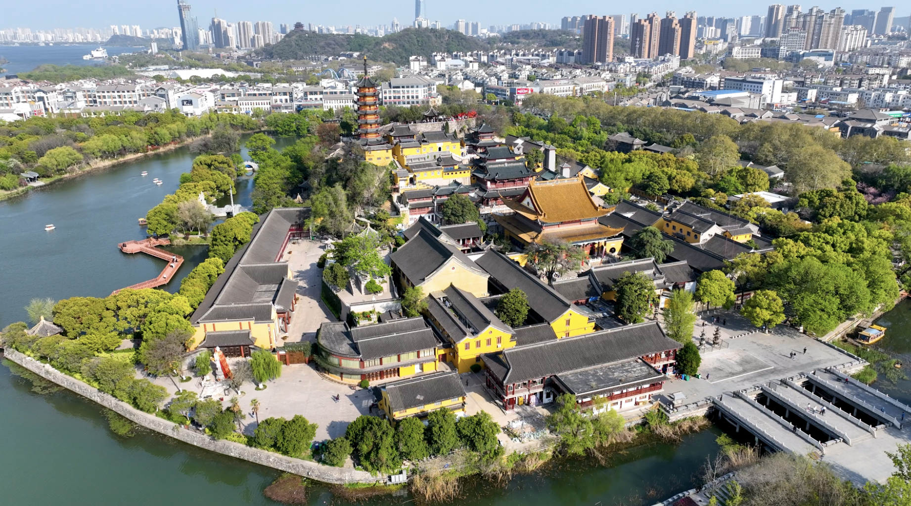 金山风景区,是国家AAAAA级旅游景区,它是以"京口三山"之首,位于镇江市区西北部,北回归线以北。有44米高, 520米周长,原是扬子江中的岛屿,"万川东注,一岛中立",有江心一朵"芙蓉"之美称。宋朝沈括的"楼台两岸水相连,江南江北镜里天"的诗句,就是对当年金山的写照。金山佛寺建筑风格独特,依山而造,殿宇厅堂,亭台楼阁,椽木栋接,相比相衔,丹辉碧映,加上慈寿塔耸立于金山之巅,拔地而起,突兀云天,使整个金山仿佛就是一座宏伟壮丽的寺庙,构成了一种金碧辉煌"寺裹山"的奇特风貌。