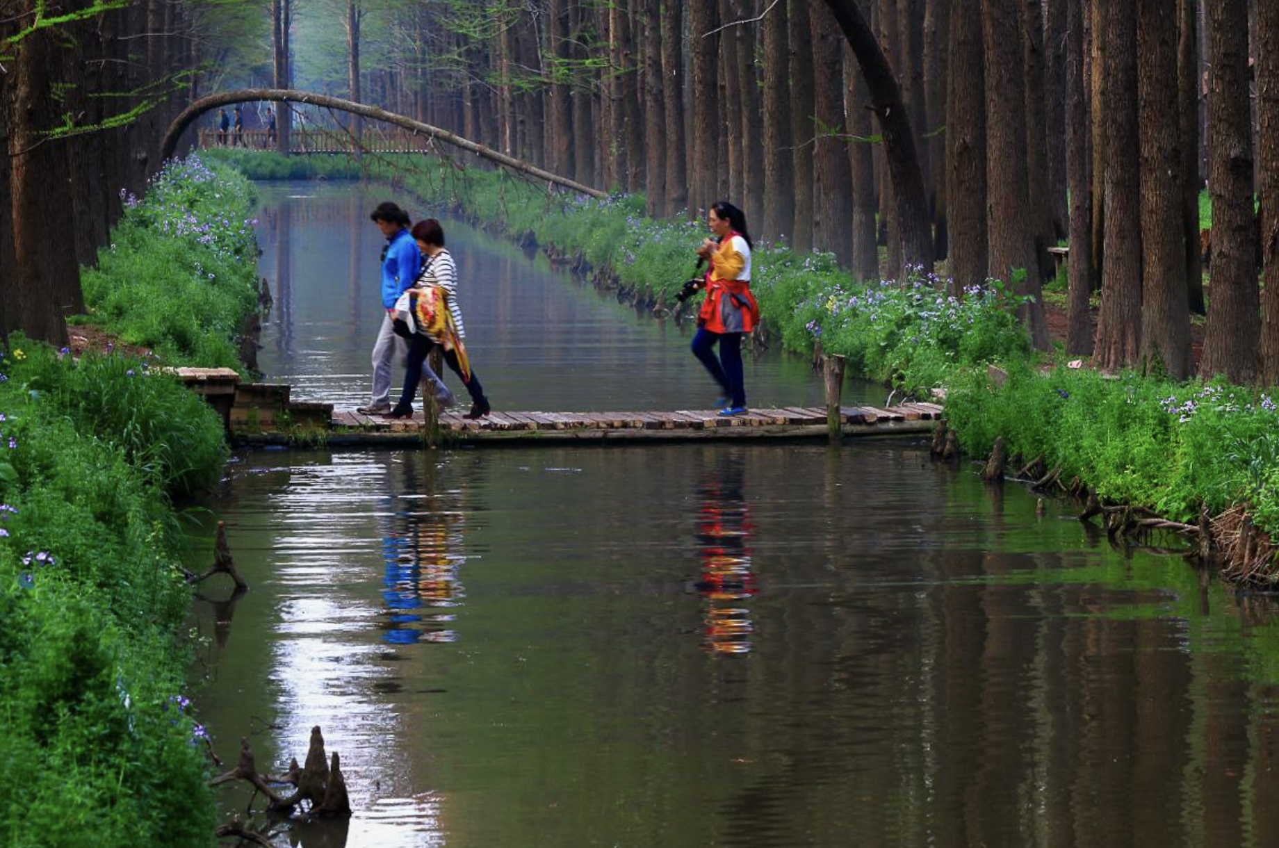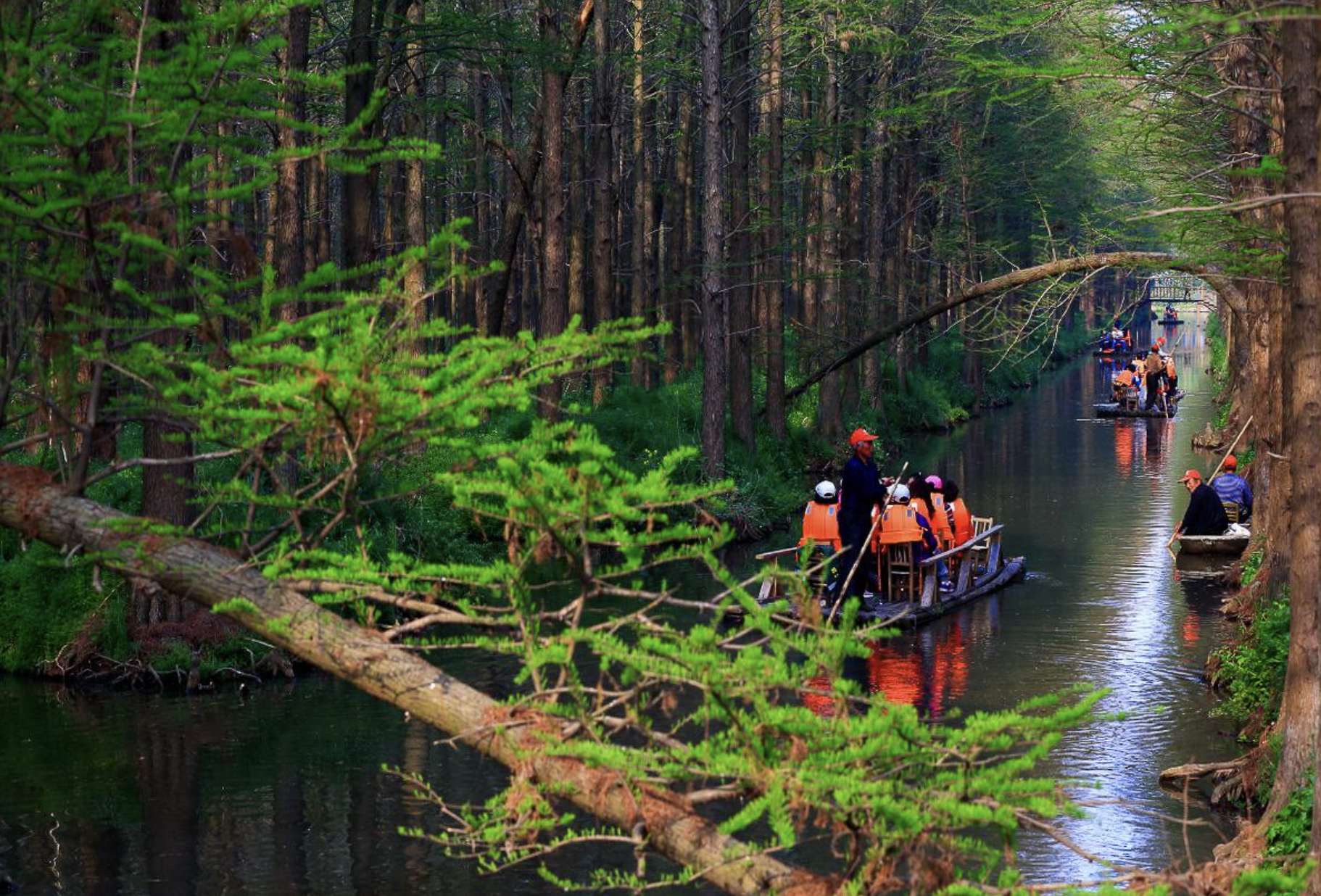 图片来源于网络,如有侵权,请联系告删李中水上森林公园是江苏省最大的人工生态森林。景区森林主要以池杉为主,白鹭、黑杜鹃、野鸭等鸟类常年栖息其中。园内水系丰富,河道纵横,形成了“河流回环,水杉林立”的景观。李中水上森林是天然的生态氧仓,是都市人回归自然、休闲度假的好去处。园中有108棵高大水杉,故取水浒108将之意,称为“好汉林”。此景名为“走好汉道、观好汉林”,“好汉道”乃长长的木质甬道,笔直地铺向密林深处;林间最具特色的游玩项目是“木筏漂流”,游客乘一片木筏,缓缓划行于密林的沟汊间,会蓦然惊起林间水滩上栖息的水鸟,扑楞楞的飞起而去,令游人领略无限野趣;水上森林的景点还有“森林迷宫”、“闻莺桥”、“落鹜亭”等。