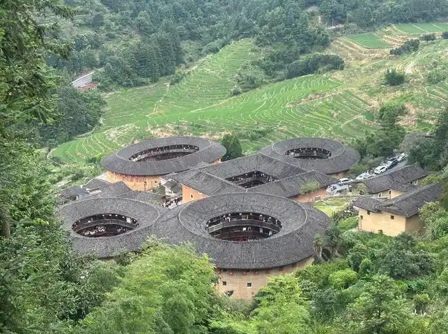 田螺坑土楼群由1座方楼(步云楼)、3座圆楼(和昌楼、振昌楼、瑞云楼)和1座椭圆楼(文昌楼)组成,依山势错落分布,形似“四菜一汤”,是福建土楼的标志性景观。景区内土楼均建于明清时期,以夯土技艺和家族聚居文化为特色,配套土楼营造技艺展示、客家山歌表演。年接待游客超200万人次,是闽南客家文化与建筑美学的活态博物馆。