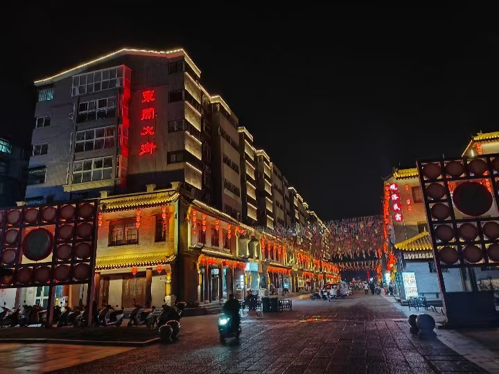 3、景区简介:铜驼暮雨文化街区是依托"洛阳八景"之一的"铜驼暮雨"历史景观打造的文化旅游综合体,占地面积约120亩。街区以盛唐文化为主题,复原了唐代里坊格局和建筑风貌,建有铜驼广场、唐风市集、非遗工坊等特色区域。街区定期举办唐风巡游、非遗展演等活动,集中展示了唐三彩、洛阳宫灯等非物质文化遗产。夜晚的铜驼暮雨街区灯火璀璨,唐风建筑与现代化商业完美融合,是体验盛唐文化和洛阳夜经济的绝佳去处。街区还设有特色美食区,汇集了洛阳水席、清真美食等地方特色餐饮。