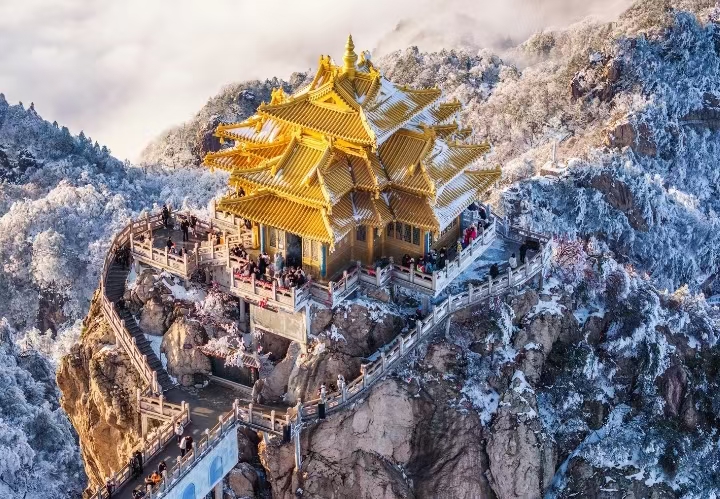 图片来源于网络,如有侵权,请联系告删老君山是国家5A级旅游景区、世界地质公园、国家级自然保护区,主峰海拔2217米,是伏牛山主峰。景区以"道教圣地、自然奇观"为主题,分为老君山、追梦谷、寨沟三大游览区,拥有独特的"滑脱峰林"地貌和壮观的云海奇观。金顶道观群依山而建,包括老君庙、道德府、玉皇顶等建筑,气势恢宏,被誉为"天下无双圣境"。景区内四季景色各异,春季山花烂漫,夏季云海翻腾,秋季层林尽染,冬季雾凇晶莹,尤其是冬季的"冰雪雾凇"景观堪称一绝。完善的索道系统和登山步道,让游客可以轻松欣赏到高山美景。