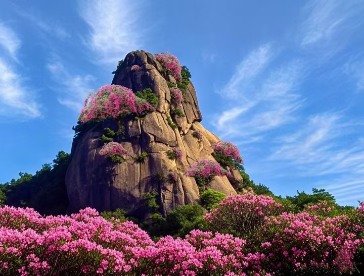图片来源于网络,如有侵权,请联系告删西泰山位于汝阳县城南52公里处,总面积120平方公里,主峰海拔1599米,以奇峰怪石、原始森林、杜鹃花海、云海日出等自然景观闻名。景区内主要景点包括炎黄峰、情侣峰、杜鹃岭、石龙沟等,其中炎黄峰因形似炎黄二帝头像而被誉为“华夏第一天然炎黄像”。每年4-5月,10万亩野生杜鹃竞相绽放,形成壮观的“杜鹃花海”,吸引众多游客前来观赏。西泰山不仅是生态旅游胜地,还是炎黄文化的象征地,景区内建有炎黄广场、炎黄文化陈列馆等文化设施,是集自然风光、文化体验、休闲度假于一体的综合性景区。