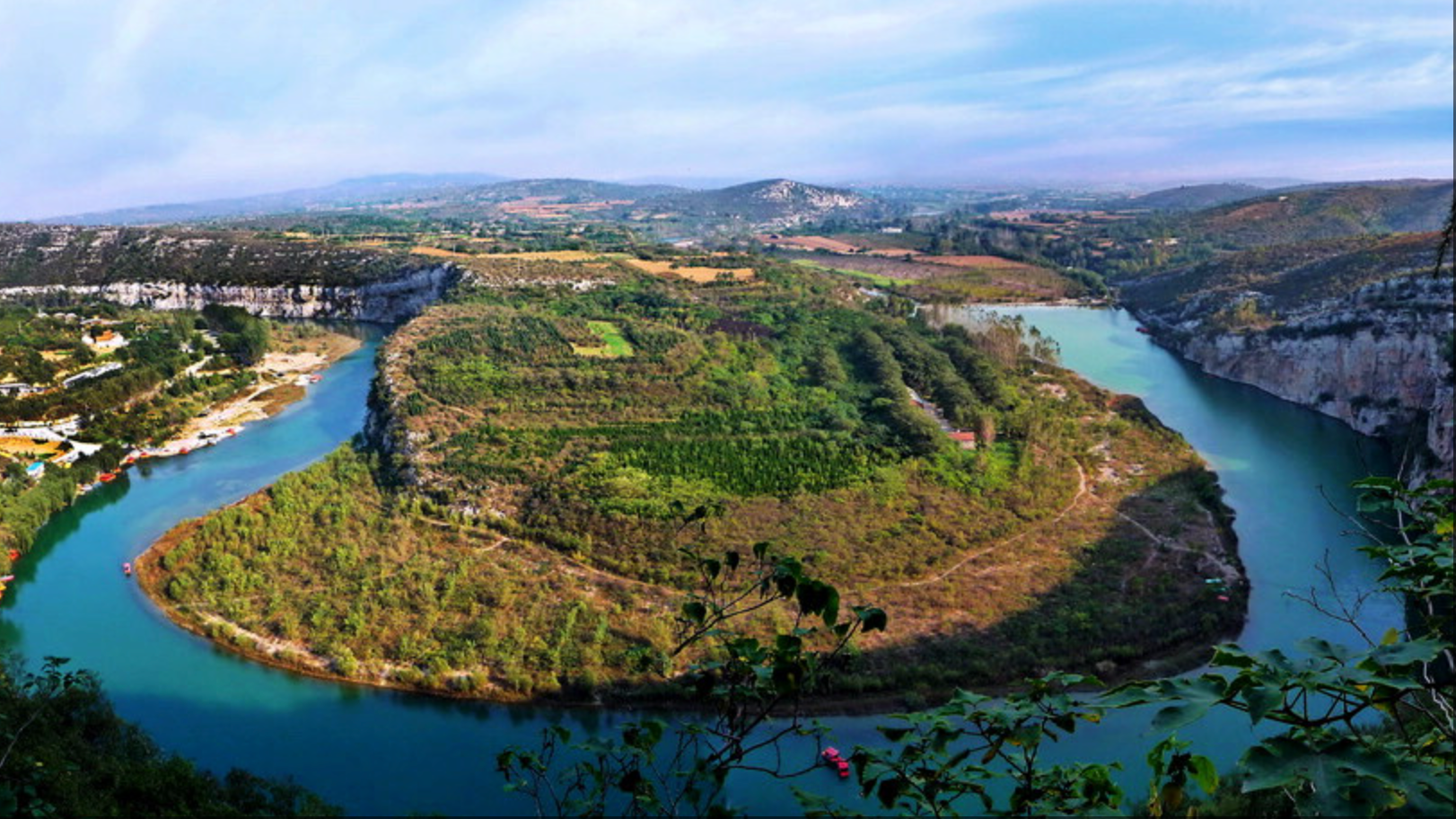 3、景区简介:淇河天然太极图景区位于鹤壁市淇滨区上峪乡,因淇河流经此处形成一幅天然太极图案而得名,被誉为“太极之源”。景区以独特的自然景观和深厚的文化内涵著称,融山水风光、周易文化、生态休闲于一体。主要景点包括太极图观景台、淇河湿地、古村落遗址等,游客可登高俯瞰壮观的太极地貌,也可漫步淇河畔感受自然静谧。景区内还设有周易文化展示区,让游客了解太极哲学与自然山水的奇妙结合。