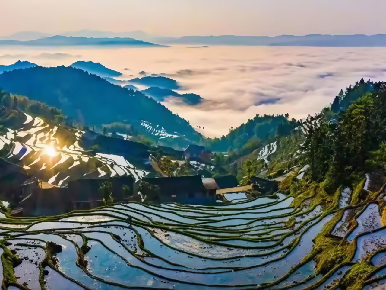 3、景区简介:娄底市紫鹊界梯田景区,位于湖南省娄底市新化县水车镇,是国家AAAA级旅游景区、国家自然与文化双遗产、国家水利风景区、国家重要农业文化遗产。娄底市紫鹊界梯田景区属于雪峰山脉奉家山系的中部,海拔1236米,最高峰海拔1585.2米,以紫鹊界梯田为中心,共有梯田56000多亩,其中集中连片的梯田在2万亩以上,主要分布于水车镇锡溪管区,从海拔500米到1100米之间,共400余级。紫鹊界梯田始于秦汉,盛于宋明,至今已有2000余年历史,是苗族、瑶族、侗族、汉族等多民族历代先民共同创造的劳动成果,是南方稻作文化与苗瑶山地渔猎文化交融揉合的历史遗存。