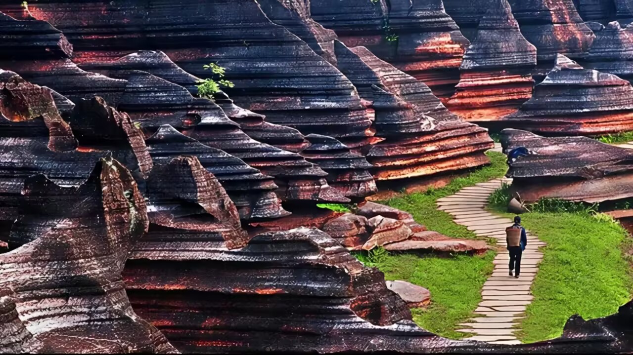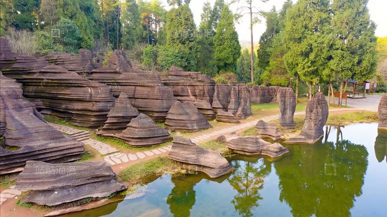 湘西土家族苗族自治州红石林景区,简称红石林景区,位于湖南省湘西土家族苗族自治州古丈县红石林镇红石林村。红石林是在寒武纪形成的红色碳酸盐岩石林,红石林景区是湖南古丈红石林国家地质公园的主要组成部分,核心景区面积20多平方公里。红石林景区的石林整体呈褐红色,色彩晴红雨黑,阴转褐红,晨昏有别:石柱高大密集,远高墙占堡,层叠高耸,雄伟壮观,近观其造型各异、气势逼人,被誉为“四亿五千万年前的海底地质奇观。