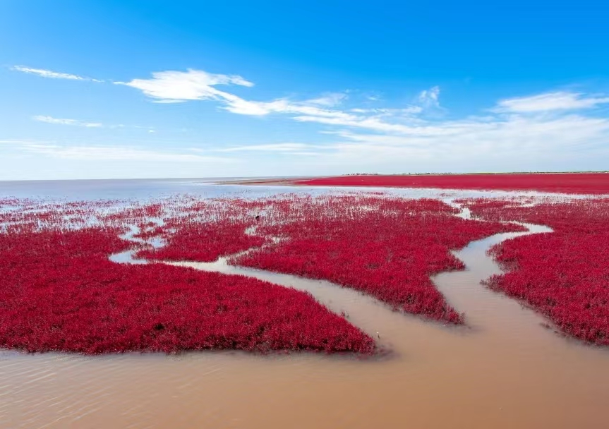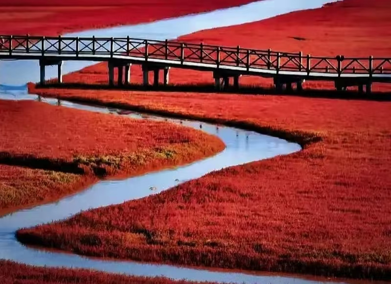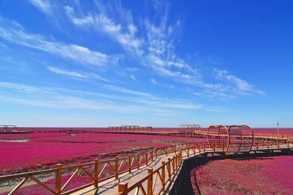 红海滩是国家5A级景区,全长18公里,以全球唯一的碱蓬草湿地景观闻名。每年9-10月,4万余亩碱蓬草形成“红色海洋”,与金色稻田、碧绿芦苇构成三色画卷。这里既有“落霞与孤鹜齐飞”的诗意,也有“万蟹横行”的生态奇观。作为国际湿地城市核心景区,红海滩以“生态优先”理念打造“春观鸟、夏戏浪、秋赏红、冬踏冰”四季旅游品牌,年接待游客超200万人次,成为盘锦“湿地之都”的标志性名片。