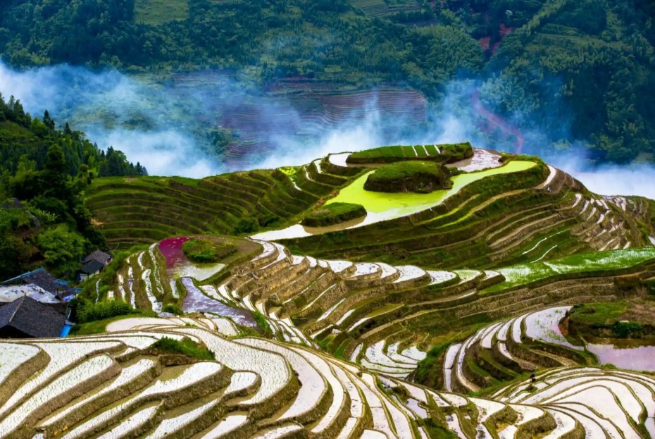 图片来源于网络,如有侵权,请联系告删龙脊梯田是龙胜文旅局首推的文旅核心品牌,占地70平方公里,2024年携程评分4.8/5,年接待游客超300万人次。核心亮点包括:世界级农业遗产:梯田层级最高达1100级,形成“七星伴月”“九龙五虎”“西山韶乐”等标志性景观,2018年被联合国粮农组织列为“全球重要农业文化遗产地”;民族文化活态传承:平安壮寨、黄洛瑶寨等13个民族村寨保存完整,红瑶长发习俗(最长1.7米)、壮族干栏式木楼建筑群(250年历史)入选国家级非遗;四季景观:春季镜面梯田倒映云海,夏季翠绿稻浪绵延,秋季金黄稻穗层叠,冬季银装素裹如水墨画卷。