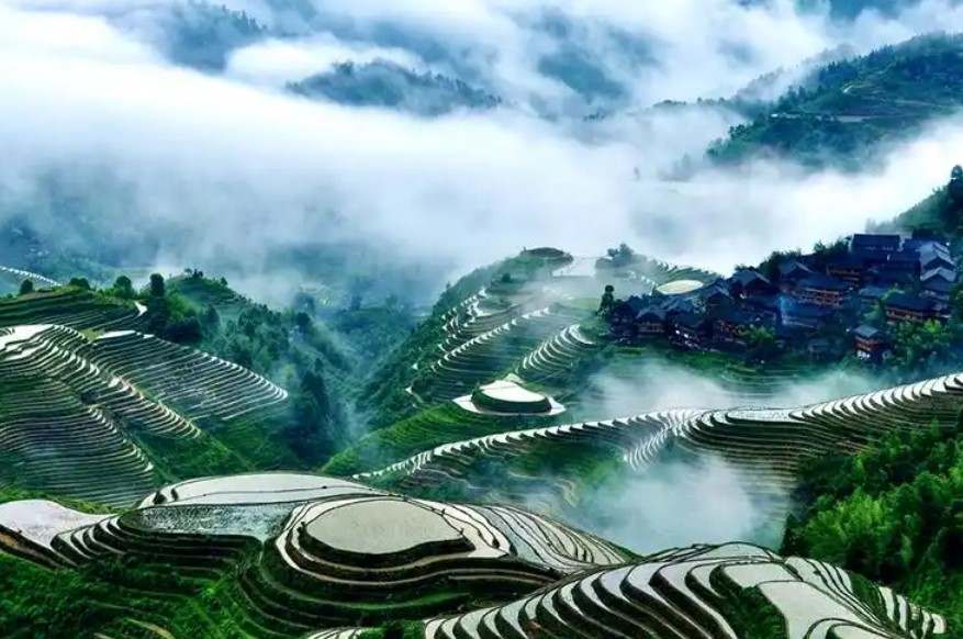 3、景区简介:龙脊梯田是龙胜文旅局首推的文旅核心品牌,占地70平方公里,2024年携程评分4.8/5,年接待游客超300万人次。核心亮点包括:世界级农业遗产:梯田层级最高达1100级,形成“七星伴月”“九龙五虎”“西山韶乐”等标志性景观,2018年被联合国粮农组织列为“全球重要农业文化遗产地”;民族文化活态传承:平安壮寨、黄洛瑶寨等13个民族村寨保存完整,红瑶长发习俗(最长1.7米)、壮族干栏式木楼建筑群(250年历史)入选国家级非遗;四季景观:春季镜面梯田倒映云海,夏季翠绿稻浪绵延,秋季金黄稻穗层叠,冬季银装素裹如水墨画卷。