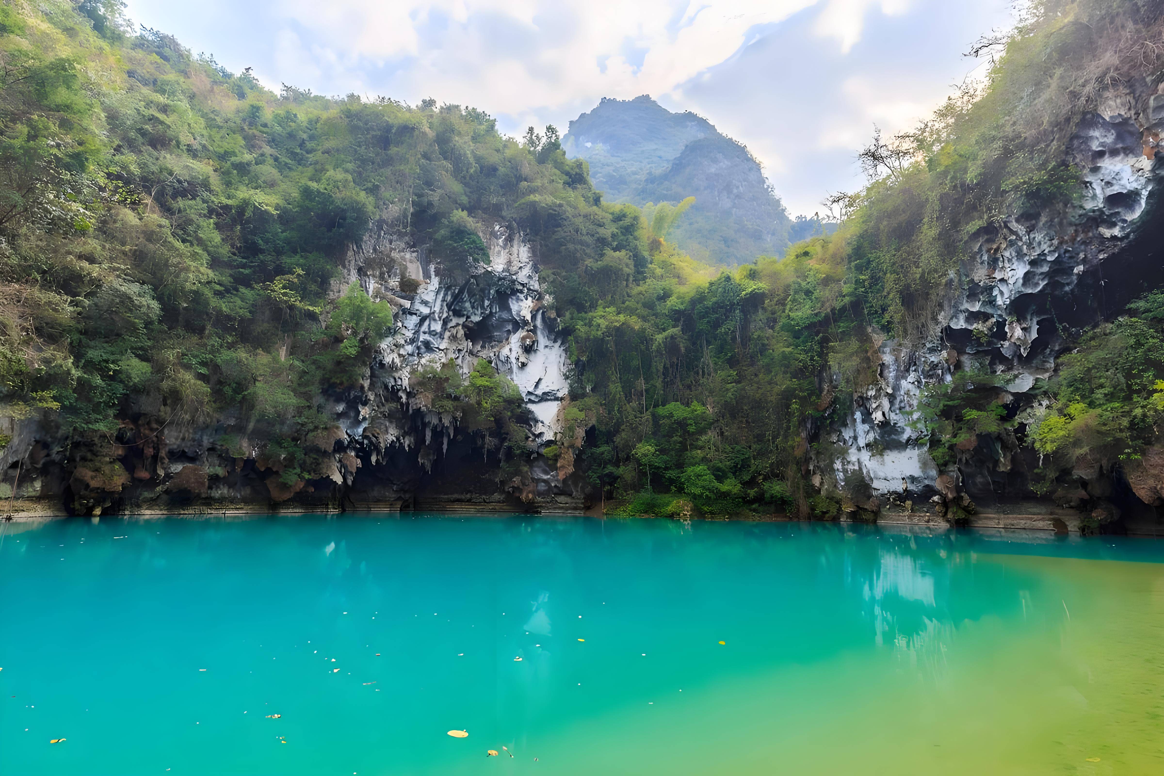图片来源于网络,如有侵权,请联系告删三门海是凤山县文旅局首推的核心景区,总面积36平方公里,2024年携程评分4.8/5,年接待游客超60万人次。核心亮点包括:地质奇观:世界唯一可乘船游览的水上天坑群,7个串珠式天窗呈北斗七星排列,形成“山中有海、海上有门”的奇幻景观,被《中国国家地理》评为“中国最美天窗群”;生态秘境:地下暗河与明湖交错,水质达国家Ⅰ类标准,阳光穿透天窗形成蓝色晶宫效果,可乘竹筏穿越3个水上洞穴,体验“地心漂流”;