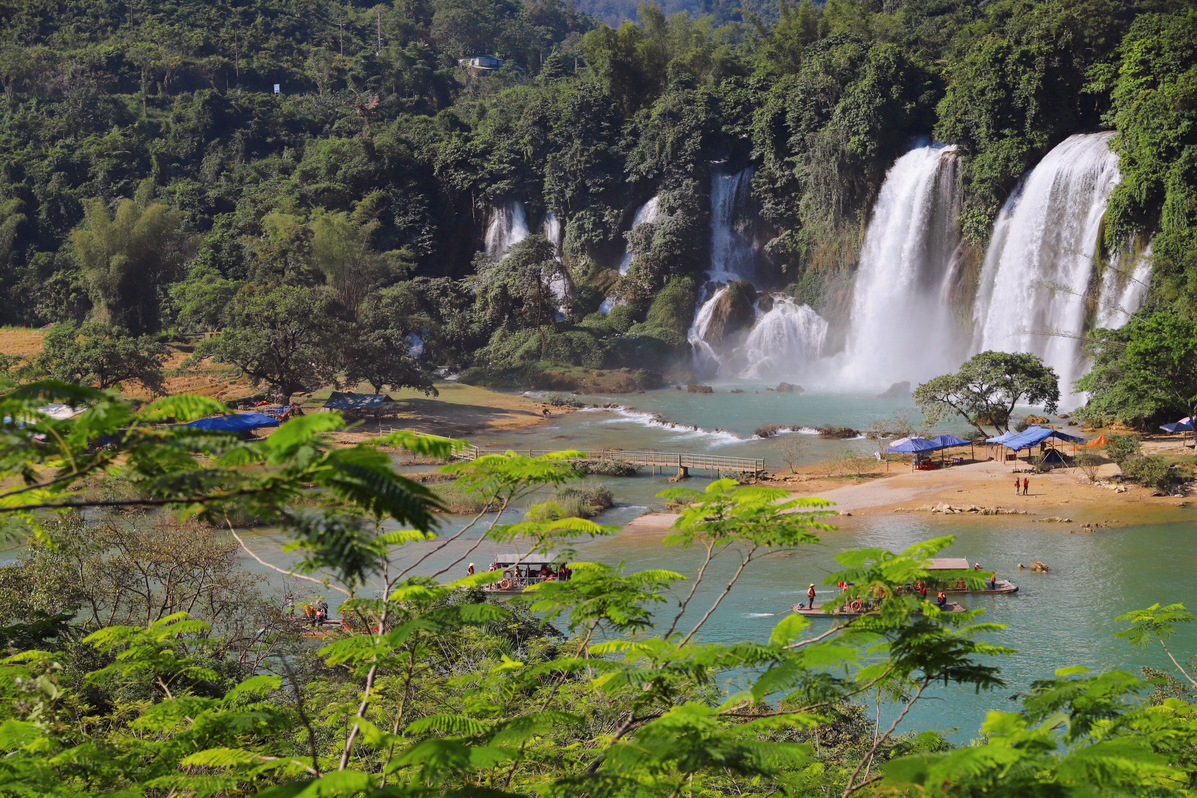 3、景区简介:德天跨国瀑布是亚洲第一大、世界第四大跨国瀑布,横跨中越两国,年均水流量为黄果树瀑布的3倍。核心亮点包括:自然奇观:瀑布宽200余米,落差70米,三级跌落的磅礴水势被《中国国家地理》评为“中国最美六大瀑布之一”;跨境体验:乘竹筏可近距离感受越南板约瀑布的飞珠溅玉,界河中央“一脚踏两国”打卡点日均接待游客超5000人次;夜间经济:2025年升级《奇妙·夜德天》实景光影秀,通过声光电技术还原骆越先民祭祀场景;科技赋能:新增AR导览眼镜,实时解析瀑布地质形成与边境历史故事。