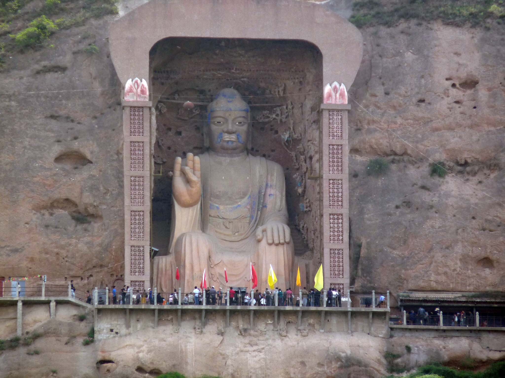 3. 景区简介:大像山景区位于甘肃省天水市甘谷县大像山镇五里铺大像山,是国家4A级旅游景区、全国重点文物保护单位。山体呈旗形纵贯南北,现存22个窟龛及北魏至唐代开凿的释迦牟尼石胎泥塑大佛,佛像高23.3米,肩宽9.5米,窟顶呈圆拱形并残存悬塑飞天造像,属古丝绸之路上融石窟与古建为一体的文化遗存。景区占地面积约640亩,自山脚至山顶建有1.5公里石阶步道,沿途分布松桧丛林、丁香花带及依山而建的亭台楼阁。核心景观包含禅窟、大圆拱龛等特殊窟龛结构。