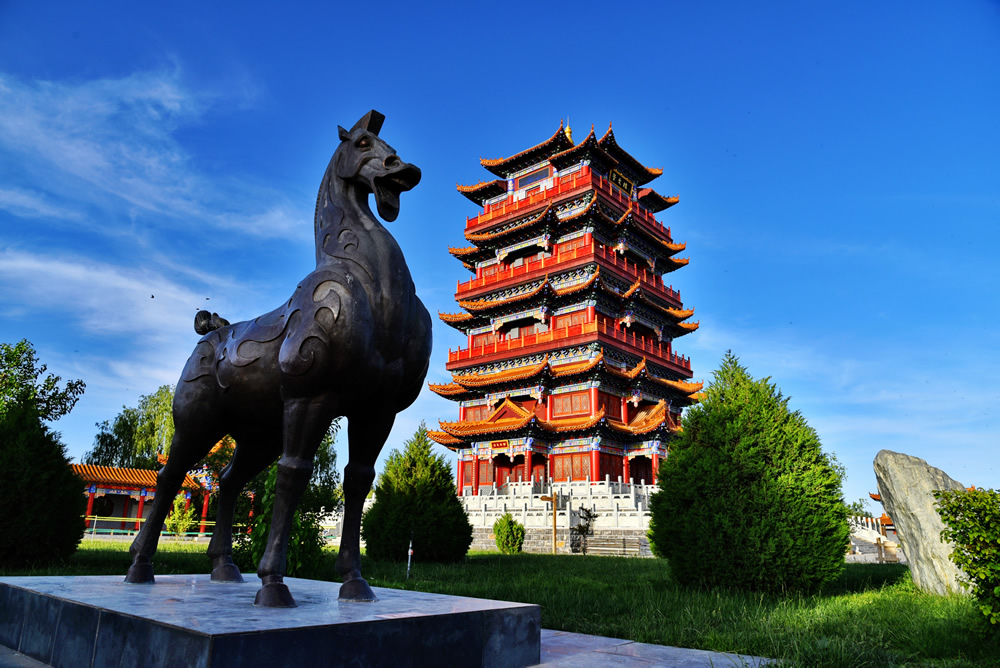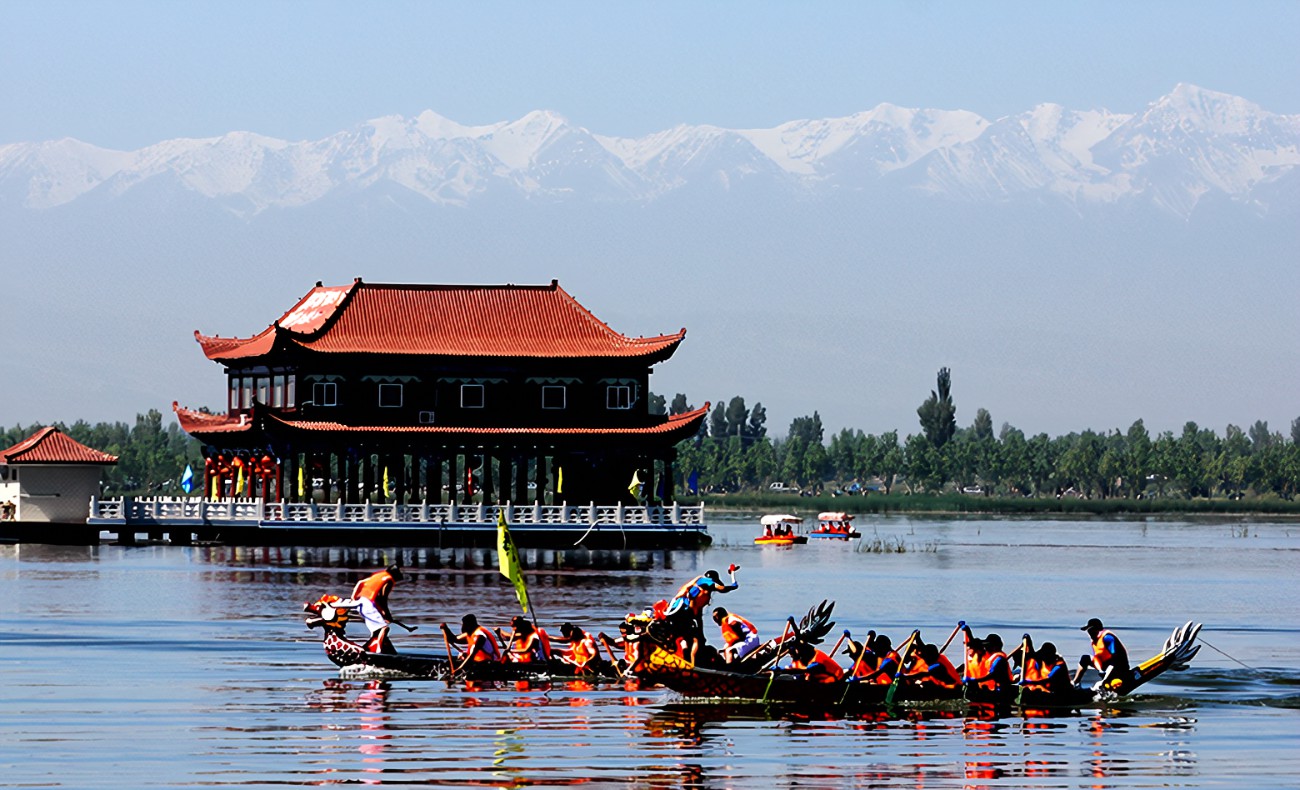 3. 景区简介:大湖湾文化旅游风景区位于甘肃省张掖市高台县城以西6公里处,水域面积达3.5平方公里,2014年获评国家4A级旅游景区。景区融合西北雄浑与江南水乡风貌特色,植被覆盖率达95%,是全球候鸟迁徙通道“中亚-印度通道”的重要中转站,栖息黑鹳、白尾海雕等20余种国家级保护候鸟。核心景观崇文楼高41.68米,内部展示高台历史文化和天文知识,登顶可俯瞰全景。景区配套画舫游船、观光小火车等设施,每年举办端午龙舟赛等传统文化活动。2014年获评国家4A级旅游景区,2018年通过国家水利风景区复核。2022年入选“甘肃省十大生态旅游示范基地” ,2024年入围“中国西部最具魅力湿地”评选名单。