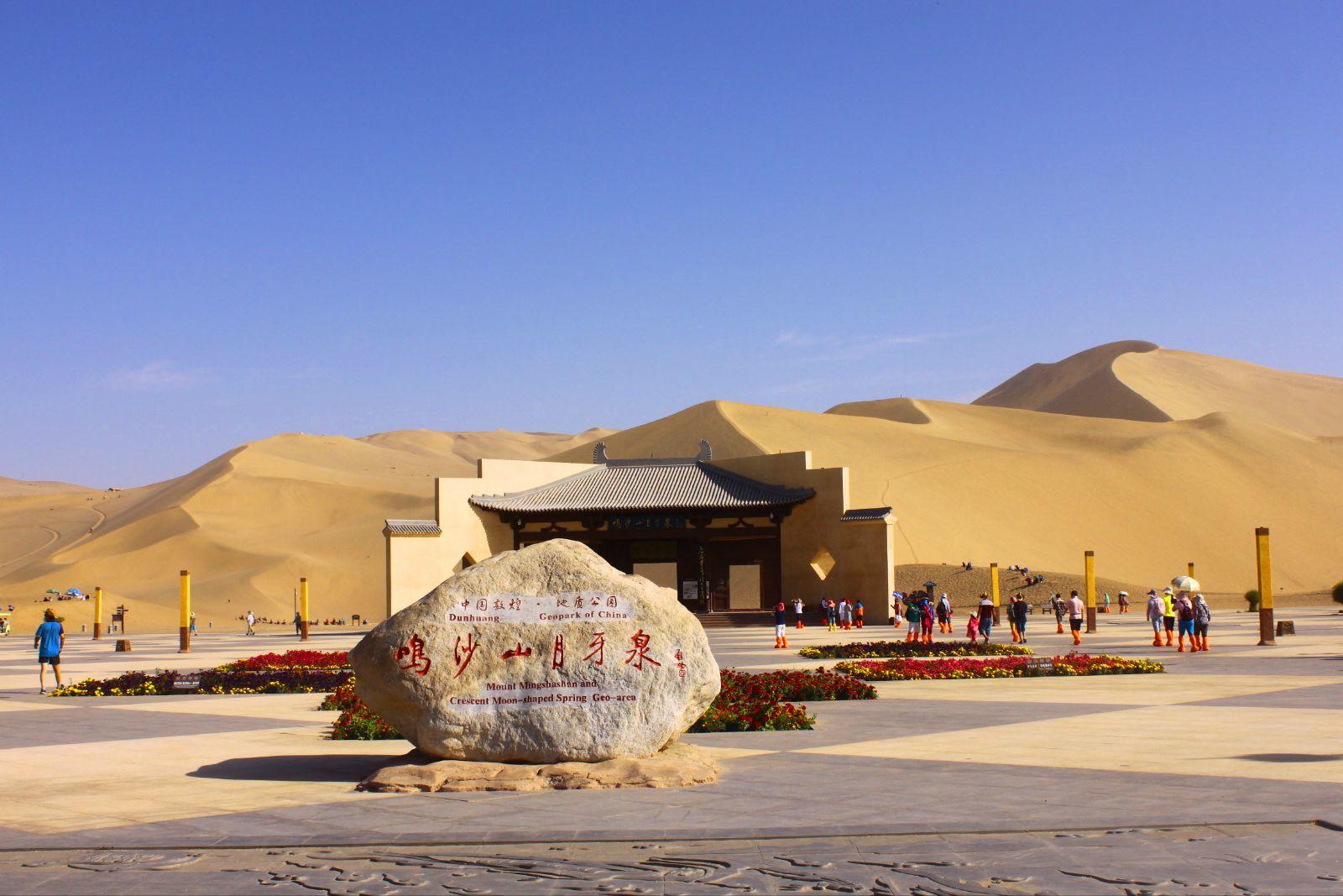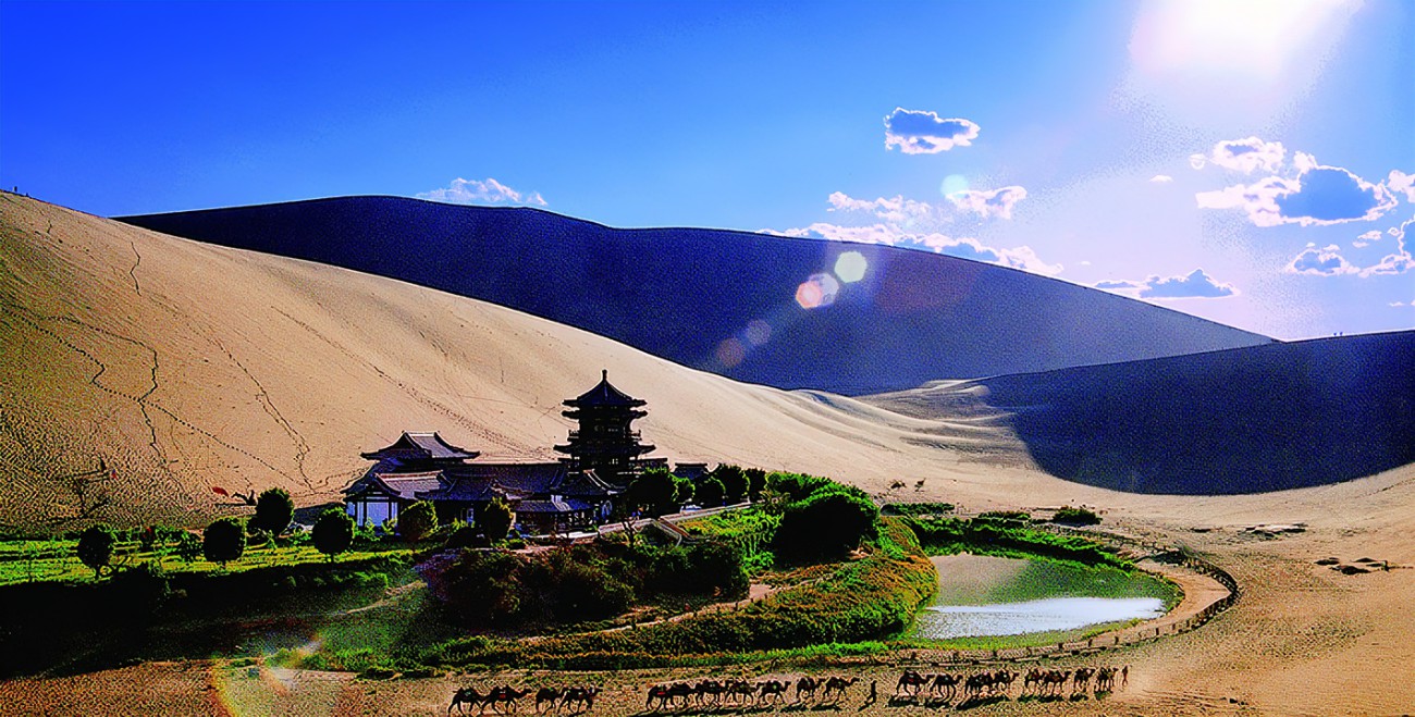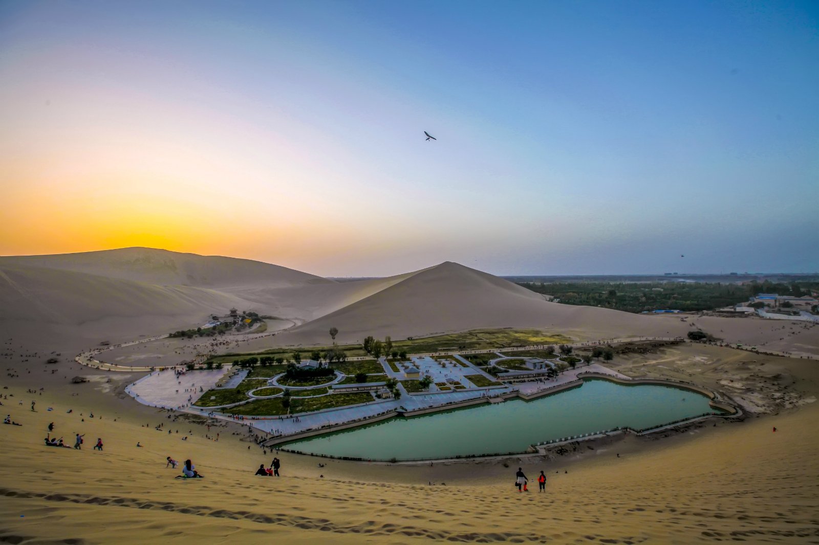 图片来源于网络,如有侵权,请联系告删鸣沙山月牙泉景区,位于甘肃省酒泉市敦煌市城南5千米处,占地面积为76.82平方千米,核心景区面积界定为12.79平方千米。以山泉共处,沙水共生的沙漠奇观著称于世,被誉为“塞外风光之一绝”。敦煌鸣沙山月牙泉景区属于典型的暖温带干旱性气候,鸣沙山东起莫高窟,西至党河口,东西绵延40千米,南北宽约20千米,主峰海拔1715米,山体由红、黄、绿、黑、白、五色细沙堆积而成。月牙泉地处鸣沙山的环抱之中,因形状似一弯新月而得名,泉内产有铁背鱼和中药材七星草。敦煌鸣沙山月牙泉景区有中门、东门、西门3个入口,由6大景区组成,主要景点有第一泉石碑、夫妻柳、月牙泉、鸣沙山、药王庙遗址等。1994年,敦煌鸣沙山月牙泉景区被定为国家重点风景名胜区。2005年,荣获“中国最美的五大沙漠之一”荣誉称号。2015年,敦煌鸣沙山月牙泉景区获评国家AAAAA级旅游景区、中国敦煌世界地质公园。