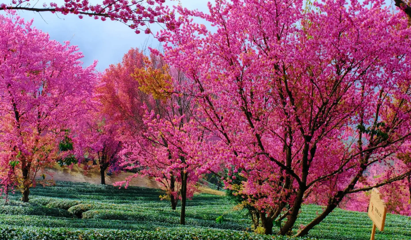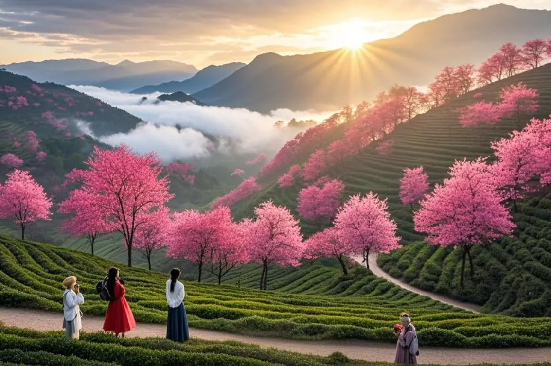 图片来源于网络,如有侵权,请联系告删无量山樱花谷是冬季赏樱秘境,占地约2000亩,每年11月至次年1月,10万株冬樱花竞相绽放,与茶园梯田交相辉映。景区内设观景台、徒步栈道和茶园体验区,可参与采茶制茶、彝族篝火晚会等活动,2023年入选“中国十大浪漫旅行地”。