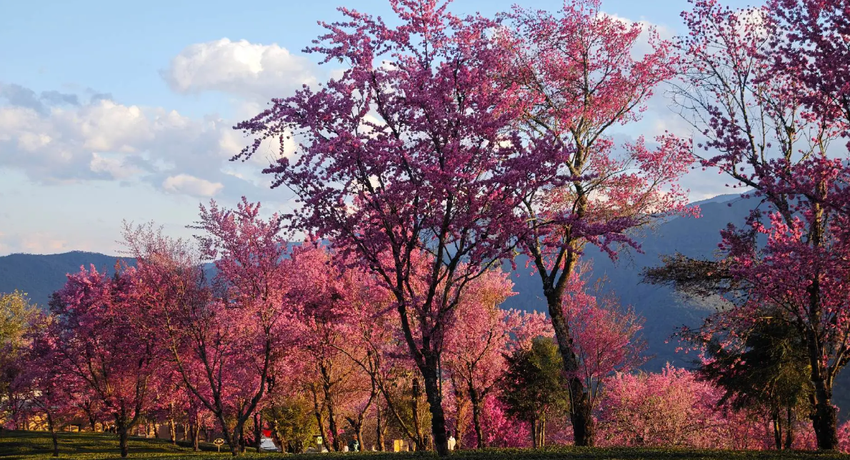 3、景区简介:无量山樱花谷是冬季赏樱秘境,占地约2000亩,每年11月至次年1月,10万株冬樱花竞相绽放,与茶园梯田交相辉映。景区内设观景台、徒步栈道和茶园体验区,可参与采茶制茶、彝族篝火晚会等活动,2023年入选“中国十大浪漫旅行地”。