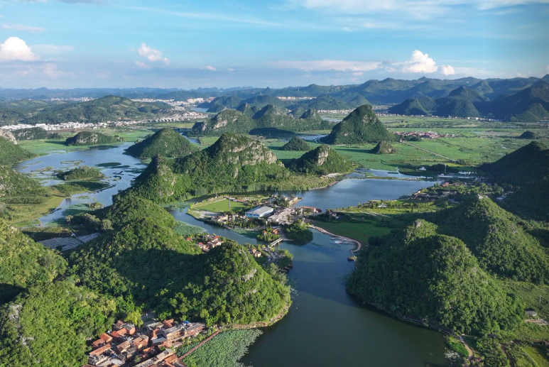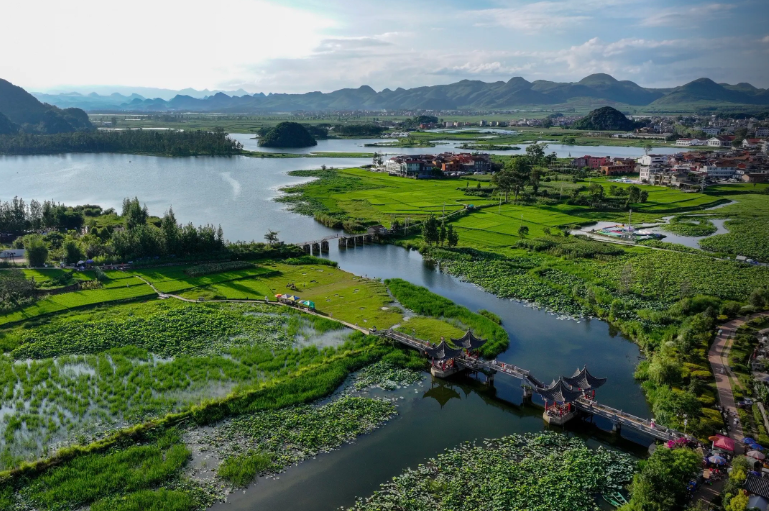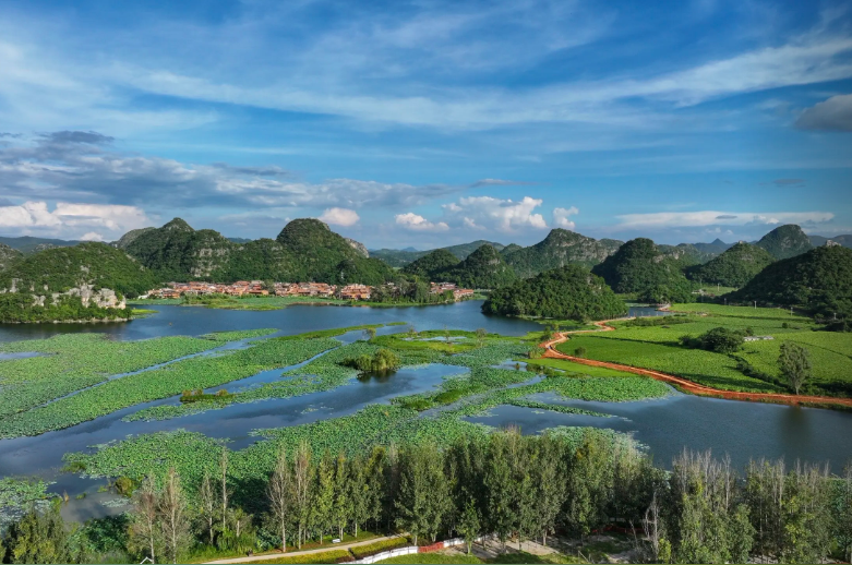 3、景区简介:国家5A级旅游景区,以“水上田园、湖泊峰林、彝家水乡、岩溶湿地、荷花世界、候鸟天堂”六大景观闻名。景区内有312座孤峰、83个溶洞、54个湖泊,夏季万亩荷花盛开,冬季候鸟栖息,四季景色各异。核心玩法包括乘柳叶舟游湖、探秘仙人洞溶洞、登青龙山俯瞰全景,还可体验彝族撒尼人的花脸节和火把节。