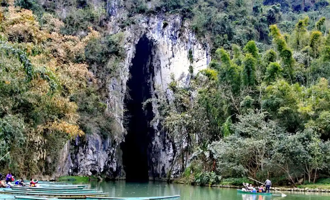 图片来源于网络,如有侵权,请联系告删国家4A级景区,以陶渊明笔下“桃花源”为原型打造。游客需乘船穿越千米溶洞进入村落,村内壮族干栏式建筑、千年榕树、稻田水系构成“土地平旷,屋舍俨然”的田园画卷。核心体验包括乘竹筏穿越溶洞、壮族服饰拍照、参与三月三歌节。