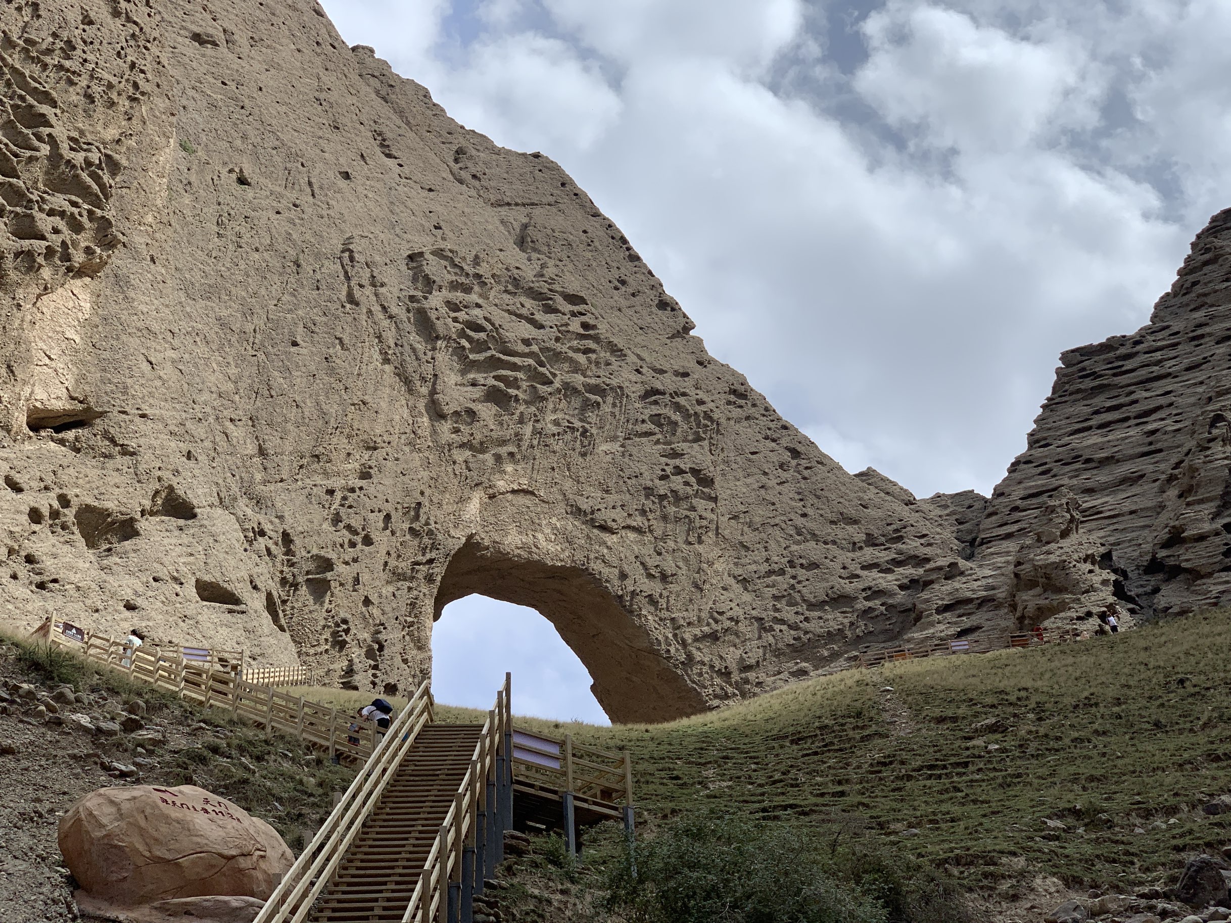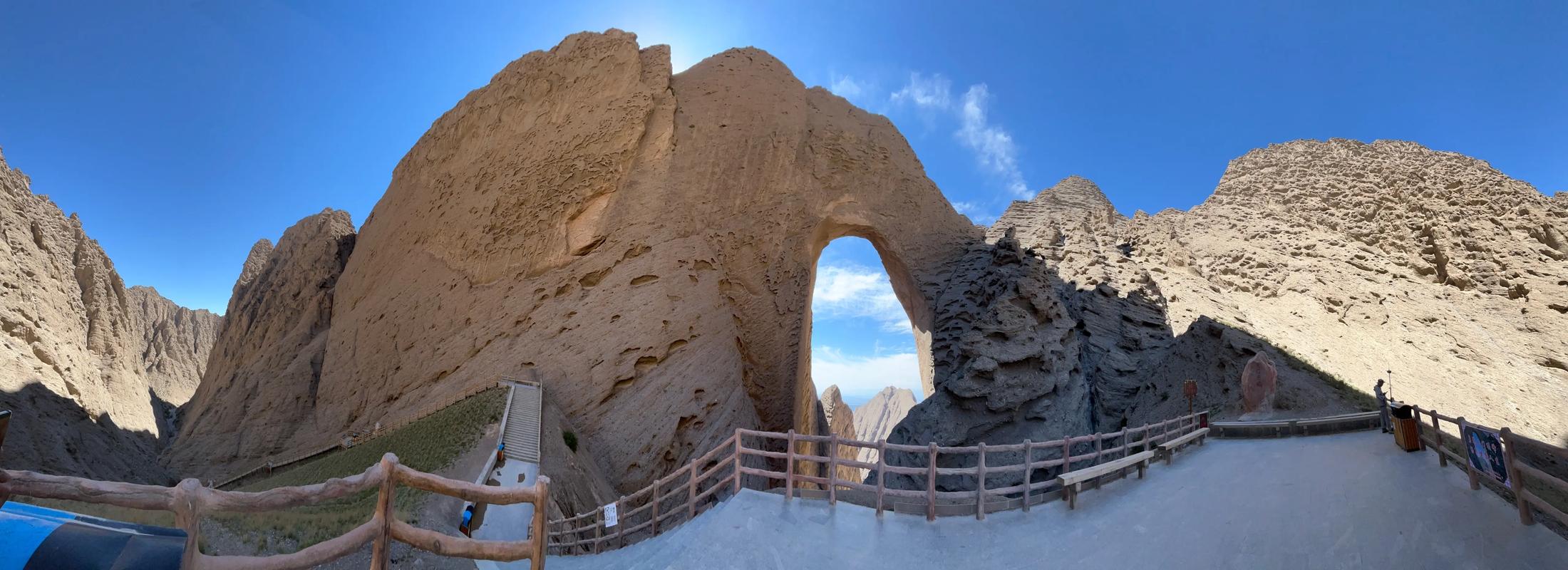 3.景区简介:阿图什天门是位于新疆阿图什市上阿图什镇西天山南脉的天然石拱门景观,地理坐标为东经75°31'22-75°31'47,北纬39°39'29-39°40'11。该天门宽约100米,高约500余米,呈"∩"字型或"Π"字型,为世界上自然形成的最高拱门。2005年被美国《ADVENTURE》杂志列为全球25条最新探险线路之一,2018年央视《地理·中国》栏目曾拍摄《神天之门》纪录片。天门景区为国家AAA级旅游景区,阿图什天门景区属温带大陆性干旱气候,夏季凉爽、天气多变、昼夜温差大。景区内部沿途可见约260万年前经风雨侵蚀形成的象形山体,如金猴守岁、日月门、天地轮回、一线天、小天门等自然景观。阿图什天门雄奇险峻、千沟万壑、鬼斧神工、幽深境秘,是罕见的高海拔穿山溶洞,也是世界上自然形成的最高拱门,被评为全球最新的25条探险线路之一。