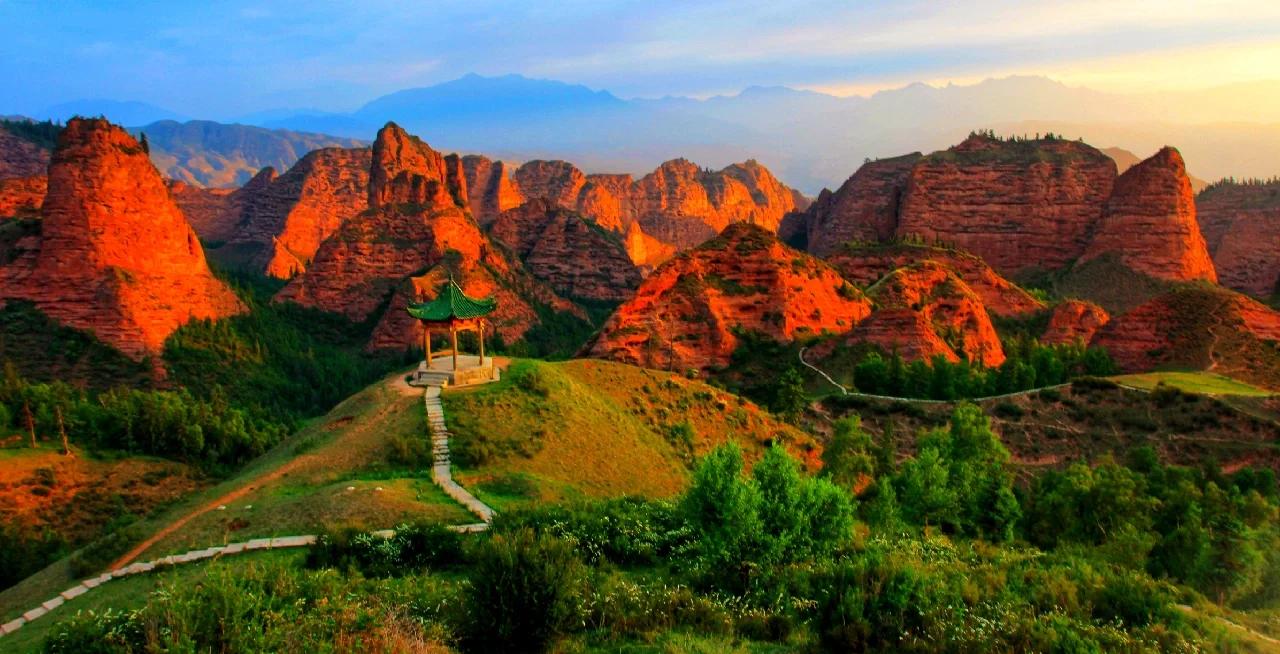 3.景区简介:青海坎布拉国家森林公园位于青海省黄南藏族自治州尖扎县境内,为国家级森林公园,被国家旅游局评为4A级景区,2025年4月获批联合国教科文组织世界地质公园称号。距青海省西宁市131公里,距尖扎县城50公里,高原大陆性气候,景区面积152平方公里,平均海拔2500米,最高海拔3100米,最低海拔2300米,最低气温为-11℃,年均温度-6℃-2.9℃。坎布拉国家森林公园以奇特“丹霞”地貌、茂密的森林植被、古老的宗教文化、雄伟的电站大坝、绮丽的峡谷库区及独特的藏族风情所构成,集自然景观和人文景观于一身。公园地处青藏高原和黄土高原交会区域,涵盖丹霞峰林地貌、新生界沉积环境及3800万年以来的地质演化遗迹,由红色砂砾岩构成的岩体表面丹红如霞,奇峰、方山、洞穴、峭壁为主要地貌特征 。景区覆盖尖扎县、同仁市和泽库县的麦秀地区,融合丹霞地貌、麦秀原始森林和隆务河峡谷风光三大景观带。坎布拉地质公园内现存阿琼南宗寺、南宗尼寺等藏传佛教寺院,其中阿琼南宗寺为宁玛派寺院,南宗尼寺以尼姑数量众多著称。