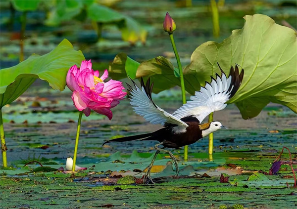 青西郊野公园:夏日炎炎,绿意葱茏,这里不仅有水上森林、田园风光、自然野趣,更能在大莲湖畔一睹“接天莲叶无穷碧,映日荷花别样红”的醉人光景。在这里,你可以观赏到300多种荷花,花讯连续不断,花期超长。独特的湿地环境还吸引来被称为“水中凤凰”的水雉等稀有鸟类前来栖息繁育,它们在荷花和芡实中悠闲觅食,如同仙境。