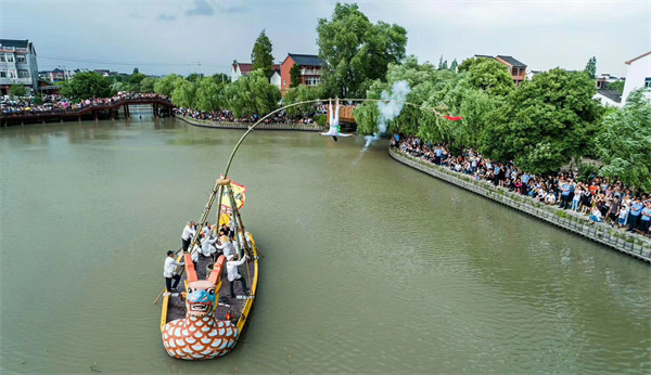 国家级非遗高杆船技:在洲泉镇,每年清明前后,会举办特色的蚕花水会,游客可以近距离观看国家级非遗高杆船技。高杆船由两只农用木船并排绑扎而成,船面铺满木板,“高杆”是一支粗壮带梢的毛竹,以石臼为杆基,用三支较粗的毛竹绑扎成三角支撑,使高杆稳稳竖立于船头。演出时,表演者需徒手攀爬到10余米高的毛竹上,在被压弯的毛竹竹梢做出一系列精彩又惊险的动作。“人在杆上翻、杆在船上立、船在河中行”,它独特而又巧妙,呈现出鲜明的水乡、蚕乡特色。