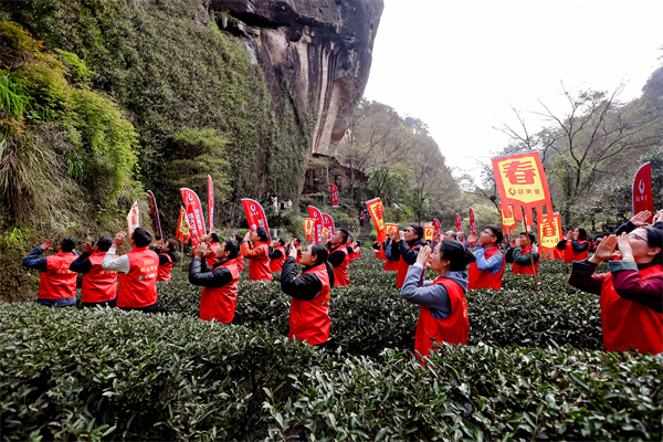 喊山祭茶仪式:最早源于元朝至顺二年(1331),当年武夷岩茶成为朝廷贡品,身价倍增,声名鹊起,管辖崇安县的建宁府总管为长享当地茶业兴隆带来的荣华富贵,便在专为皇家焙茶的御茶园的通仙井之畔建了一个高五尺、方一丈六尺的“喊山台”。山上再建一座“喊山寺”,用于供奉茶神杨太白。每年惊蛰之日,御茶园的官吏偕同当地县令带领做茶的隶卒,亲自登临喊山台,祭祀茶神,乞求神灵庇护来年风调雨顺,茶叶丰收。武夷茶农喊山的古老祭神仪式便源于此。除武夷山九龙窠母树大红袍主会场传统喊山外,天心永乐禅寺、正山堂-桐木村、黄村茗川世府、朝阳村、天心村、莲花峰等地也同时举行喊山祭茶。