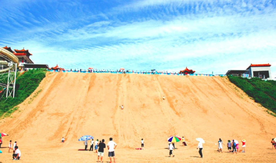 3、景区简介:黄金海岸国际滑沙中心(又称秦皇岛国际滑沙娱乐中心或南戴河国际滑沙中心)位于河北省秦皇岛市昌黎县黄金海岸的中部,毗邻渤海,坐拥长达52.1公里的海岸线。该中心占地面积广阔,拥有得天独厚的自然资源,包括细腻柔软的沙滩、连绵不绝的沙丘以及苍翠茂密的林带,这些自然元素与大海巧妙融合,构成了一幅美丽而自然的海洋大漠风光。作为黄金海岸独有的旅游项目,滑沙是这里最吸引人的运动项目,游客可以乘坐索道缆车直达沙顶,然后坐在轻巧快速的滑沙板上,从几十米高的沙山上呼啸而下,体验既新鲜刺激又安全可靠的滑沙乐趣。此外,景区还提供了热气球、旅游直升飞机、降落伞、乘快艇等多种游乐项目,是休闲度假、避暑消夏的绝佳之地。
