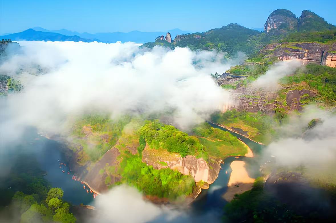 3.景区简介:武夷山是中国首批国家公园,以丹霞地貌、九曲溪竹筏漂流和岩茶文化闻名全球。核心景观包括天游峰(“武夷第一胜境”)、大红袍母树(树龄360年)、一线天(最窄处仅30厘米)。景区涵盖36峰、99岩及古汉城遗址,年接待游客超500万人次,配套茶文化体验、实景演出《印象大红袍》,是自然与人文深度融合的世界级旅游目的地。