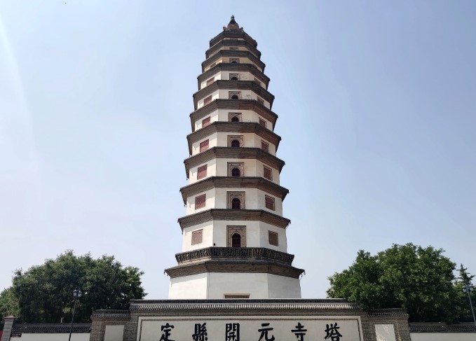 3、景区简介:开元寺塔,又名料敌塔,因塔建于开元寺内,故通称“开元寺塔”。位于河北省定州市南城门内东侧开元寺内。北宋咸平四年(1001年),宋真宗为了供奉开元寺僧令能从古印度取回的佛经、舍利而下诏建寺筑塔,北宋至和二年(1055年)建成,历时55年。因定州为辽、宋双方接近的军事要地,宋朝为了防御契丹,利用此塔瞭望敌情,故名“料敌塔”(或“瞭敌塔”)。定县开元寺塔为八角形楼阁建筑,是中国现存较高的古砖塔,造型端庄威武,塔身十一级,从下至上按比例逐层收缩。塔内结构为外塔体环抱内塔体,楼梯从内塔体穿心盘旋到达塔身顶部。塔身由内外层衔接,形成塔内藏塔的奇特结构。定县开元寺塔是一座集建筑艺术、佛教文化、书法绘画艺术于一体的佛塔,在中国古代建筑史上占有重要地位。