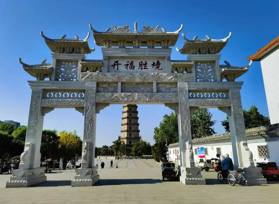 3、景区简介:景州塔,又叫开福寺舍利塔,原名“释迦文舍利宝塔”,位于河北省衡水市景县城内西北角的开福寺内。原有寺院建筑已毁,仅塔犹存,建筑面积1500平方米。据碑文记载,塔建于北宋元丰二年(1079年),后经历代重修。开福寺舍利塔为砖砌楼阁式双套简结构,八边十三层,底边长6.31米,塔高63.85米,塔内梯道为穿心式结构,每层辟4个门洞,另外四面做砖雕盲窗。塔身为清水砌砖,塔檐下施五铺作斗拱,上承叠涩出檐。塔刹由砖砌仰莲基座、相轮、葫芦组成。开福寺舍利塔内有佛经、佛像及金银珠宝等物。1996年11月20日,开福寺舍利塔被中华人民共和国国务院公布为第四批全国重点文物保护单位。