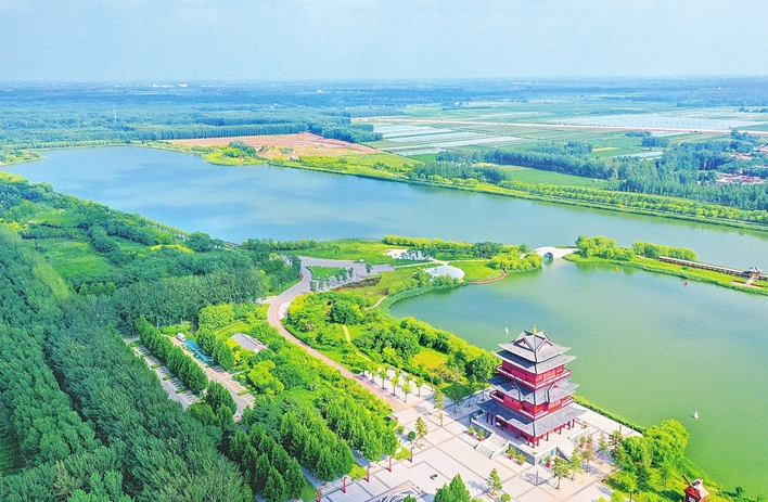 3、景区简介:阜城湖公园位于河北省衡水市阜城县城东南5公里的千顷洼腹地,占地面积2400亩,核心湖区1200亩,是国家AAA级旅游景区。公园以“森林水岸、生态阜城”为主题,景观设计融合苏州园林风格与地方特色,形成环湖生态廊道区、西湖滨水体验区、东湖生态涵养区和传统文化展示区四大功能分区。核心建筑龙砚阁为仿唐古建筑,高36.99米,阁内藏有北京奥运会献礼作品“中华第一龙砚”,该砚重66吨、长13.8米,雕刻56条龙及中国版图等元素。园内通过随坡就坎的微地形设计,栽植本地乔灌木3万余株,最高树龄达500余年。主要景观包含禹王山、七星岛、荷花园、牡丹园等九大特色景点,其中禹王山建有禹王亭和禹王像,传承大禹治水历史记忆。湖区原为邯黄铁路取土深坑,经生态治理形成人工湖,与万亩森林公园共同构成“绿、蓝、红、文”综合体系。公园通过引黄入冀工程保障水系,实施滤食性鱼类生态放养策略维持水质平衡。