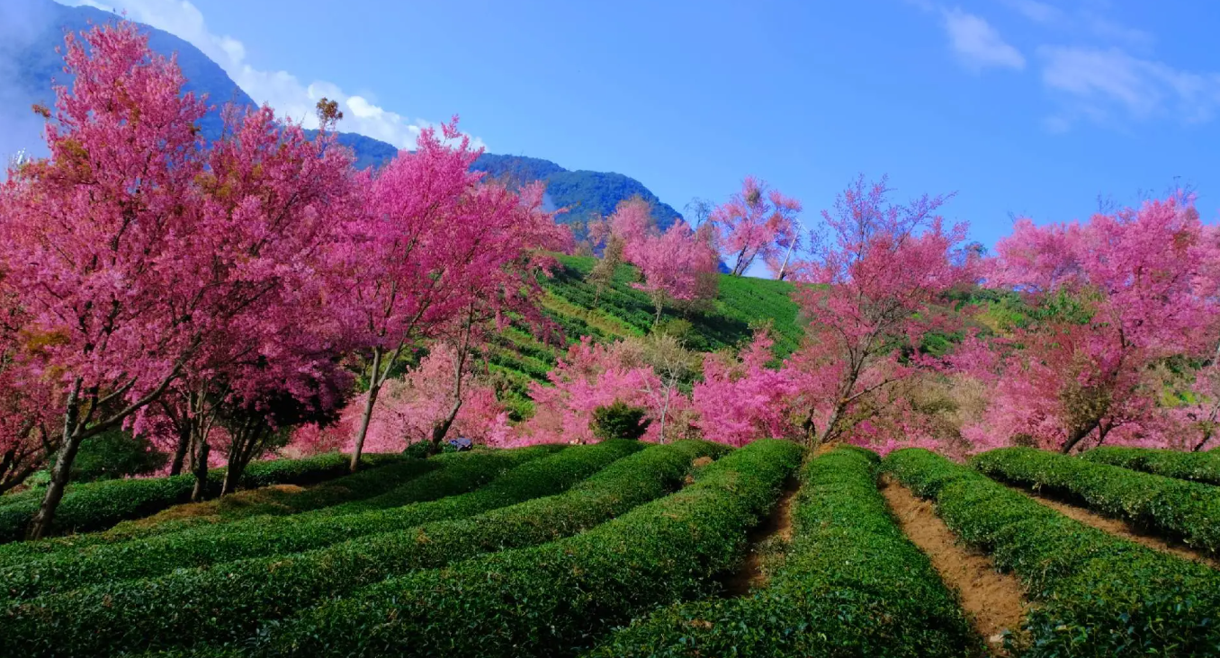 3、景区简介:无量山樱花谷是冬季赏樱秘境,占地约2000亩,每年11月至次年1月,10万株冬樱花竞相绽放,与茶园梯田交相辉映。景区内设观景台、徒步栈道和茶园体验区,可参与采茶制茶、彝族篝火晚会等活动,2023年入选“中国十大浪漫旅行地”。