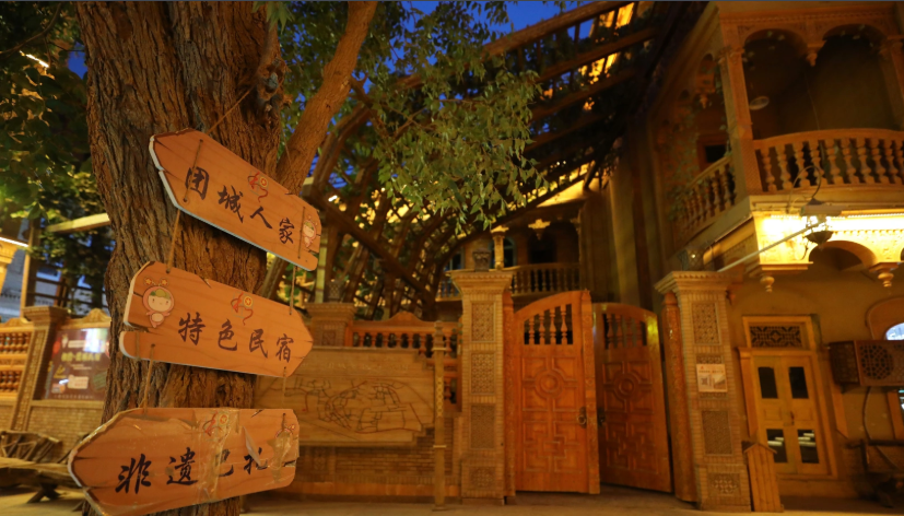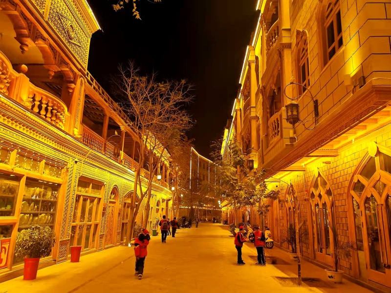 3、景区简介:和田市团城位于新疆和田市中心区域,原为历史悠久的“鸽子巷”,2016年在北京援疆资金支持下启动保护性改造工程,分三期完成3500户居民区改造,采取“一户一设计”原则修复传统民居,2024年完成三期改造后形成集居住、商贸、文旅于一体的活态历史街区。街区采用阿依旺式建筑风格,保留中心发散式街巷布局,现有686间商铺涵盖餐饮、民宿、非遗工坊等业态,打造非遗巴扎、夜间市集等特色消费场景。该街区2019年创建国家AAA级景区,2020年晋升国家AAAA级旅游景区,2021年入选首批自治区级旅游休闲街区,2022年获评“国家级旅游休闲街区”,2024年入选自治区夜间文化和旅游消费集聚区。