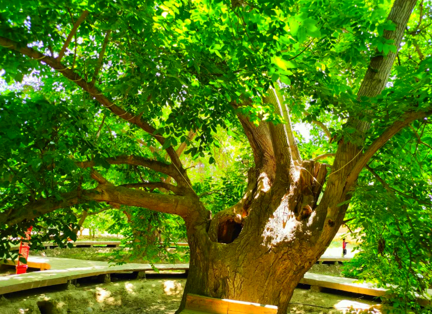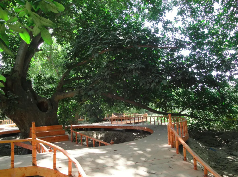 图片来源于网络,如有侵权,请联系告删桑株古核桃园为国家AA级景区,位于皮山县东南的桑株乡色依提拉村的桑珠古核桃园,景区距离皮山县城72千米,距和田市169千米,距315国道29千米。古核桃园被县政府确定为历史文化旅游景点,核桃王树高20米,胸围5.5米,需七人合围才能围住,树冠面积680平方米,年产5万个核桃,个大皮薄,果实饱满。倒地横卧的一古树,上面可站立100多个小学生。这39棵几百年树龄的核桃树,枝干苍劲、叶茂果繁、奇形怪状、颇为壮观,是丝绸之路上一道靓丽的风景。古树历经近千年沧桑,当地百姓称其为“神树”、“寿星树”,每年当地的众多群众都要跪拜老树,默默祈祷,愿自己和老树一样长寿。