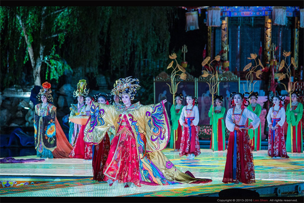 《长恨歌》:长恨歌以白居易同名传世名篇为蓝本,以骊山山体为背景,以华清池九龙湖做舞台,以亭、榭、廊、殿、垂柳、湖水为舞台元素,采用高科技舞美灯光,营造了万星闪烁的梦幻天空,滚滚而下的森林雾瀑,熊熊燃烧的湖面火海,将历史故事与实景演出相结合,重现1300多年前李隆基与杨贵妃的爱情故事,真正实现了“斯山为大幕、斯水作舞台,斯地真历史、借我入戏来”的效果,成为一个杰出的艺术典范。