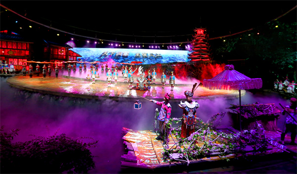 《坐妹·三江》实景演绎:是我国首部以侗族风情为主题的实景演出,深度融合了侗族地区绚烂多姿的传统文化元素,并巧妙地将侗族楼桥的舞台光影变化与现代高科技相结合,为游客全景再现侗族婚恋、劳作、歌舞等民风民俗。