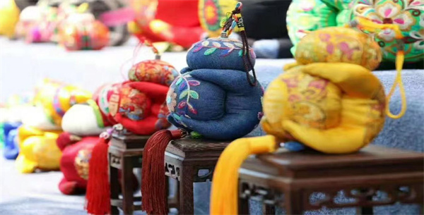 右江麽乜:由艾草、檀香、菖蒲等天然中草药及棉花填充成内芯,再缝制成形似人形张开四肢环抱圆球状的香囊,是右江上游地区壮族特有的民间吉祥饰物。在右江区福禄村二十四节气园景区的“麽乜”制作基地,游客可以亲身体验这一传统技艺的制作过程。