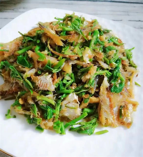 香椿拌黄尖子鱼:选取新鲜黄鲫鱼,用泉水洗净,放热油中炸至表皮焦黄、鱼刺酥脆,选取香椿芽洗净后用秘制酱料调味。香椿拌黄尖子鱼,口感独特,香酥有嚼劲,鱼肉与爽嫩的香椿芽相互搭配,使得整道菜既有大海的包容又有山野的悠长,既可以单独作为一道菜食用,也可以搭配日照煎饼等特色小吃一同食用,深受广大游客喜爱。
