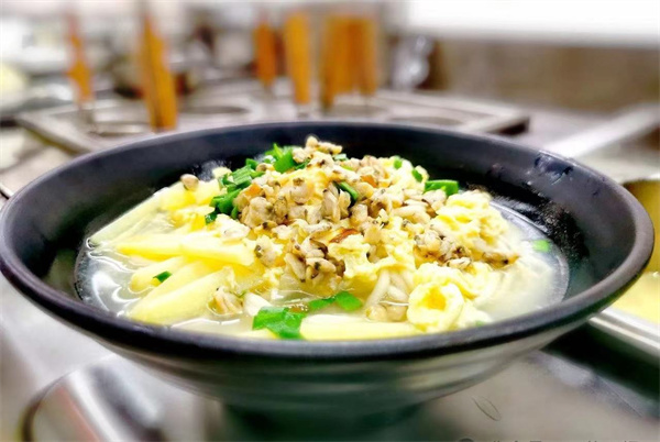 海沙子面:在日照的海边,有一种被当地人称为“海沙子”的小贝类。它是一种小巧玲珑外壳呈灰白色的海洋生物,学名“兰蛤”,它个头虽小,但富含蛋白质、矿物质和多种微量元素,具有独特的鲜美味道。经过“一洗、二淘、三煮、四滤”4个过程,形成鲜美的卤汁,搭配筋道爽弹的面条,每一口都鲜味可口。海沙子面,不仅是一道美食,更是一种情感的寄托和家乡的味道。