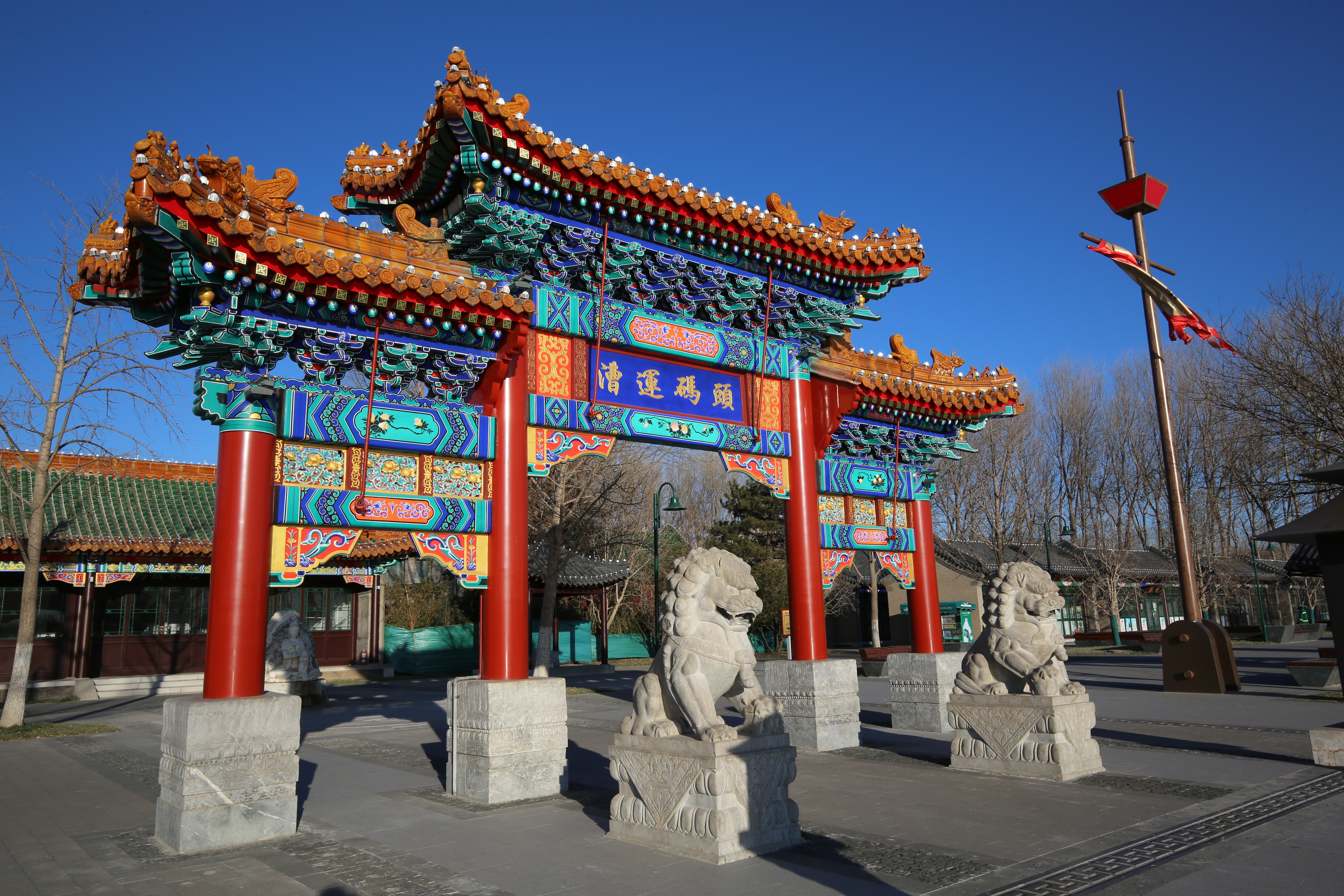 漕运码头:位于北京(通州)大运河文化旅游景区南区,这里展现了千年前运河漕运的历史场景,古老的牌楼、沧桑的驿站,让游客仿佛穿越千年回到了古代的运河盛景中。