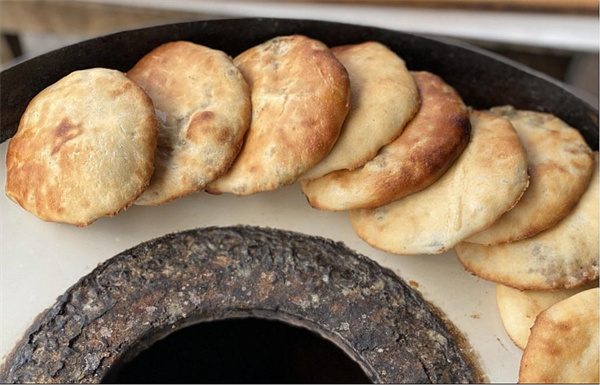 猪油馍:主要工序为发面、包馅、按平、刷料、烤制。发面用的是老式发面法,选取优质面粉,采用传统老面酵头和甜酒发酵,做成均匀面团。猪肉馍的馅,必须是新鲜的本地土猪后臀肉和五花肉,肥瘦相间,再加以新鲜细葱、姜末一起剁匀,辅以秘制调料做成肉馅。将馅包在面团里面,再用手指进行按压,让肉馅能够均匀分布在面的夹层中。这样吃起来,整个馍充斥着肉的香味。