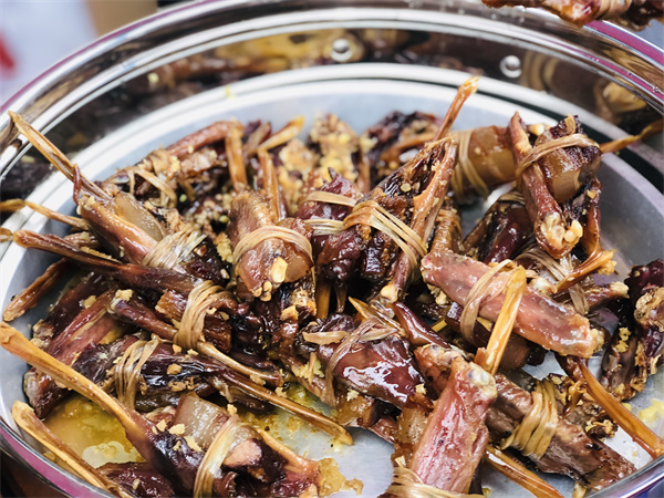 疍家腊鸭扎:“冬腊风腌,蓄以御冬”,岭南素来有“秋风起,食腊味”的美食风俗,疍家腊鸭扎就是其中的代表。作为佛山市非遗项目,疍家腊鸭扎源自疍家人在水上长期生活的风俗,在清朝已经形成了独特的食材制作与菜式烹饪技艺。疍家腊鸭扎制作时,将鸭肠、鸭中翼、鸭下巴及腊肉分别晾晒后捆扎,让各种食材的油脂互相渗透,腊鸭扎的咸香与米饭的甘甜同食,令人回味无穷。