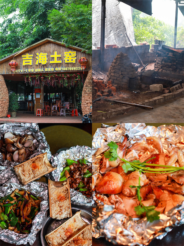 吉海土窑野外第一家:主打土窑美食,做法是将泥土烧热,再将滚烫的泥土覆盖在用锡纸包好的食物上面,用泥土的温度烤熟食物,这样做可减去煎炒油炸的油腻,使食物清新可口,有土窑鸡、土窑海鲜、土窑竹筒饭等,令人食不停箸。
